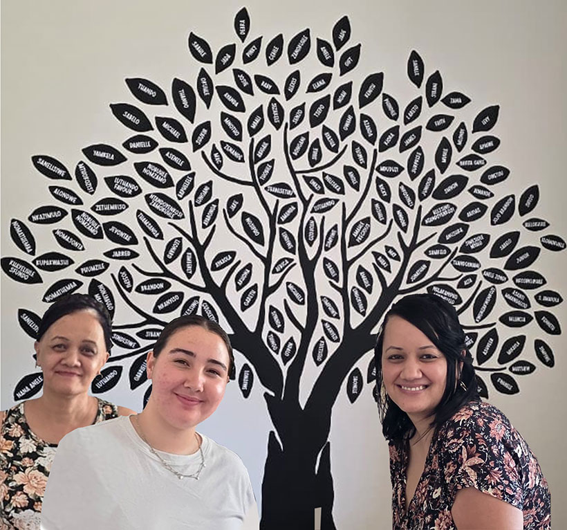 Melissa drew her inspiration from American writer and multi-faceted artist, Suzy Kassem, who said: “Family is like branches of a tree. We grow in different directions yet our roots remain as one," and designed an image of a vigorous tree and its root system which she and her small team of her mum, Carol Harris, and Kiera Clements, a past pupil of hers, then transferred to the freshly painted surface. To make the mural very especially appropriate to the home, in eight hours of pains-taking work. Kiera created stickers, one to be stuck onto each leaf on the spreading tree with the name of one of the 182 babies and toddlers who have found a safe haven at the transition home before going on to become part of their new adoptive “forever families”.
