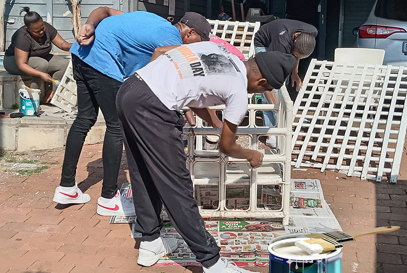 Armed with sandpaper, 5-litre tins of paint and 12cm brushes, the Durban University of Technology (DUT) set about their task with gusto. The five are all studying Public Relations and Communication Management and had been given an assignment to spend time with an NGO to get insight into the programme and develop a report-back presentation. The quintet (Zama Madlala, Sthabiso Dlamini, Nkululeko Dlamini, Cebo kuhle Hlatshwayo and Londeka Dlangisa) spent a day at Othandweni Safe House, a Durban-based shelter supporting women who are survivors of gender-based violence and sexual exploitation. It wasn’t all academic…the students marked off part of their time to wash windows and to sand and refurbish furniture.